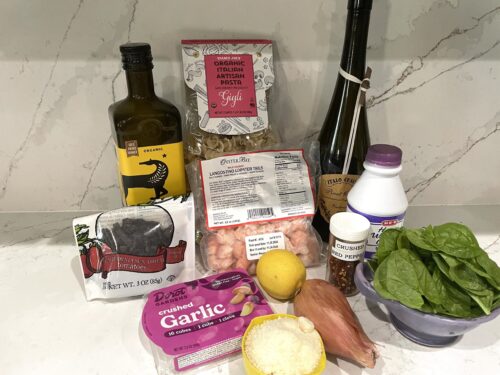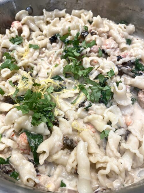 There’s something about lobster, pasta, and lemon that sounds so good on a cold Winter’s night. This recipe brings together sweet lobster, a beautifully shaped pasta, baby spinach, wine, cream and just a hint of lemon in a sauce that is silky smooth. It’s a comforting dish to enjoy — warm, elegant, cozy where the simplest ingredients become a little celebration of the Tuscan countryside. (I have fond memories of a cooking class we took at Il Borro, Italy) (If you look at the video we stayed in one of the lodgings in the medieval village.)
