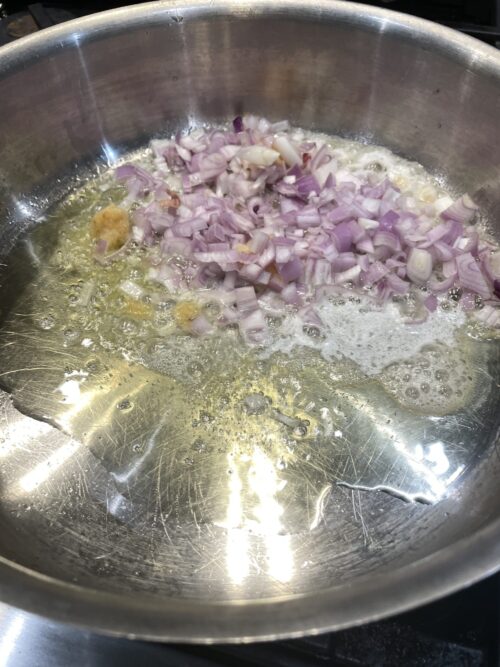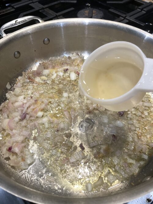 - Sauce: In a large skillet, heat the butter and olive oil over medium heat. Add shallot and garlic; sauté until fragrant and translucent (about 2 minutes). Pour in white wine; simmer until reduced by half.