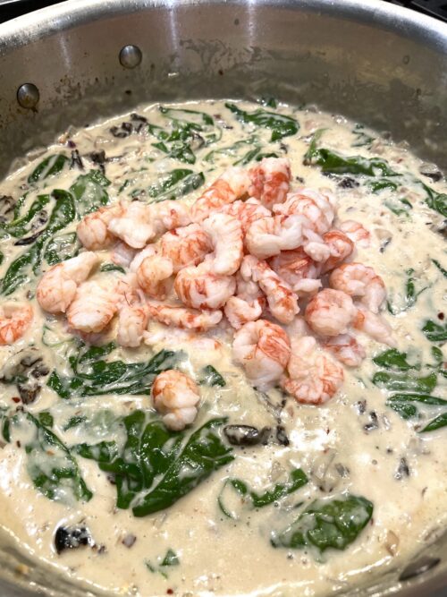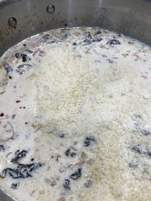 - Add cream and cheese and lower the heat and stir in the heavy cream. Add Parmesan cheese and whisk until melted and smooth. Season with salt, pepper, and optional red pepper flakes. Add lobster and gently fold in the lobster meat; cook 2–3 minutes, just to warm through (don’t overcook or it’ll toughen).