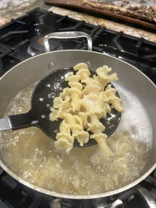 - For the pasta: Bring a large pot of salted water to a boil. Cook pasta until al dente. Reserve ½ cup of pasta water before draining.