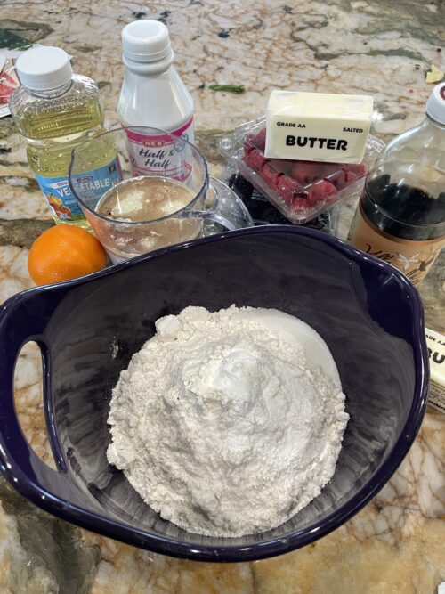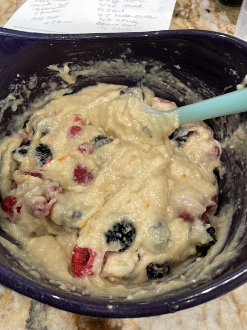 - Add the liquid ingrdients to the dry ingredients and stir just enough to mix. Stir in the berries trying ot to break up. I did cut my blackberries in half beause they were really larhe.