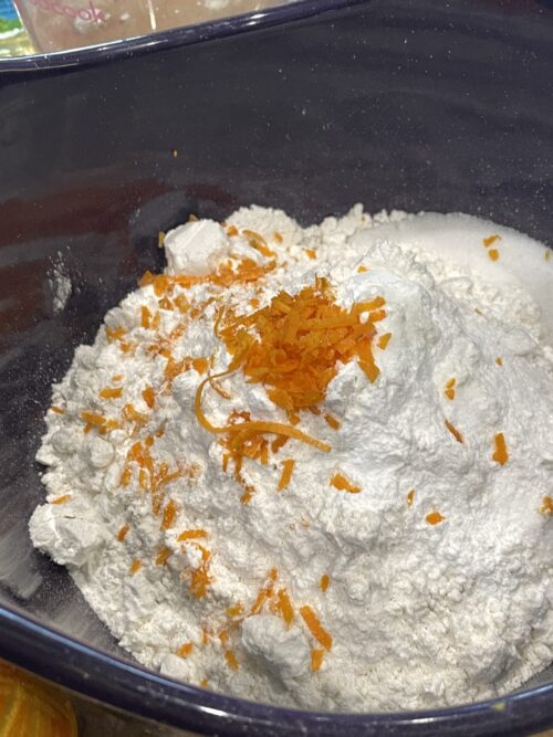 - In a large mixing bowl add the flour, sugar, salt and baking powder. I another bowl/cup mix the eggs, Half & Hal, oil, melted butter, vanilla extract and lemon zest.