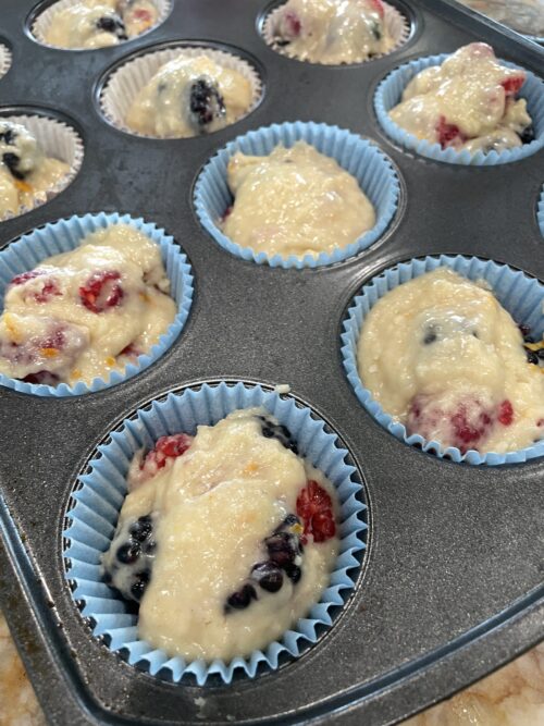 After adding the liquid ingredients and mixing, gently fold in the berries.
