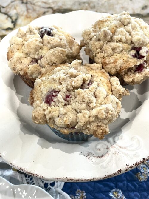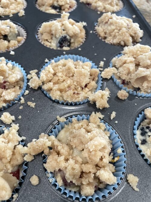 All the years I catered, I never once ran short on butter, sugar, flour, or fruit ad I knew I could always bake something. So when the ice hit, I had plenty of raspberries and blackberries on hand—and nowhere I needed to go. Which made it the perfect morning to bake up a batch of my favorite muffins for breakfast.